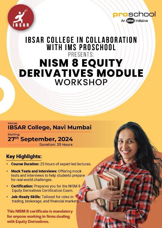 IBSAR recently conducted a highly informative NISM Series 8: Equity Derivatives Module Workshop, providing students and finance enthusiasts with valuable insights into the world of equity derivatives. The workshop covered essential topics such as futures and options, trading strategies, risk management, and regulatory frameworks. Led by industry experts, the session offered practical knowledge and hands-on learning to help participants strengthen their understanding of financial markets. The event was a great success, with enthusiastic participation and interactive discussions. IBSAR continues to organize such workshops to enhance professional learning and career growth opportunities for its students.